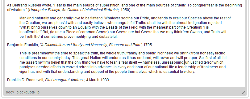 button on the toolbar. Once added, the block quote formatting appears in the document on the location of the cursor.