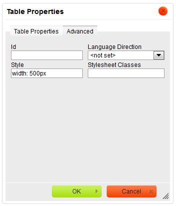 The Advanced tab lets you configure additional image options such as assign it an ID, a class, a language direction, or CSS style properties. It is meant for advanced users with knowledge of HTML as well as CSS, and gives nearly endless possibilities as far as the presentation of the table is concerned.