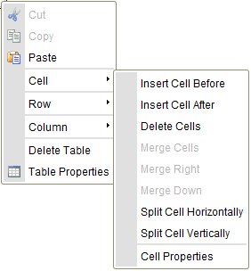 The table context menu lets you edit table cells. If you hover your mouse over the Cell menu option, further options become available.