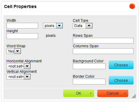 - Width - the width of the cell in pixels or a percent value. Giving the width as a percent value lets you set the proportion of the row that the cell (and the column it is located in) will occupy.