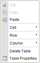 Additionally the table context menu lets you modify the rows, columns or particular table cells. This method makes it possible to insert new rows, columns or cells in specified locations as well as merge and split cells.