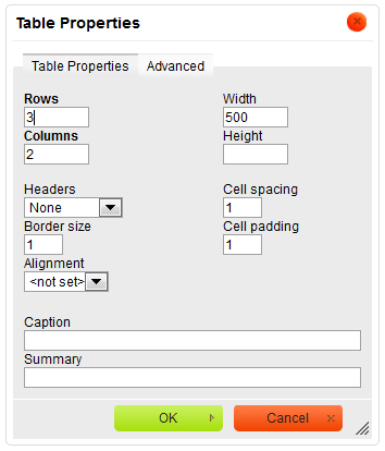 - Width - the width of the table in pixels or a percent value. Giving the width as a percent value lets you set the proportion of the editing area that the table will occupy.