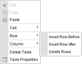 The table context menu lets you edit table rows. If you hover your mouse over the Row menu option, further options become available.