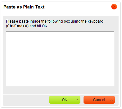 button on the toolbar. If the browser blocks Text Editor toolbar's access to clipboard, a Paste as Plain Text dialog window will appear and you will be asked to paste the fragment into the text box using the Ctrl+V keyboard shortcut.