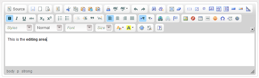 The Editing Area is the empty space below the editor toolbar where you type your text. All formatting applied using the toolbar buttons as well as all inserted media appear immediately in this area.