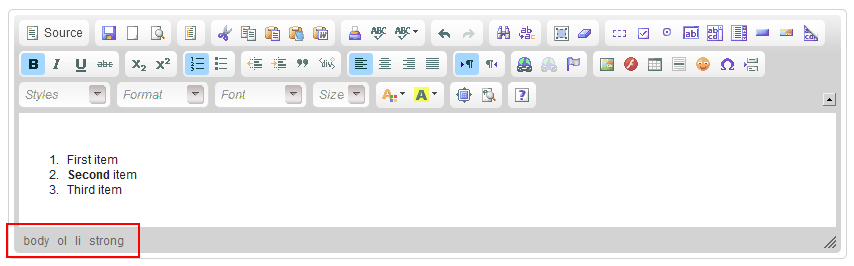 The mouse cursor is now located inside the word "Second", so the elements path shows the following hierarchy of HTML elements: body (main document element), ol (ordered list), li (list item) and strong (bold font).