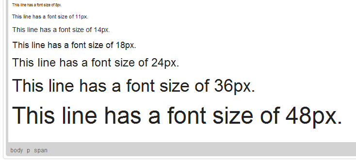 In Text Editor the Size determines how big or small a font used in the document text will be. The following values are available: 8px, 9px, 10px, 11px, 12px, 14px, 16px, 18px, 20px, 22px, 24px, 26px, 28px, 36px, 48px, and 72px. Font sizes may also be defined in a descriptive manner, like Very small or Bigger.
