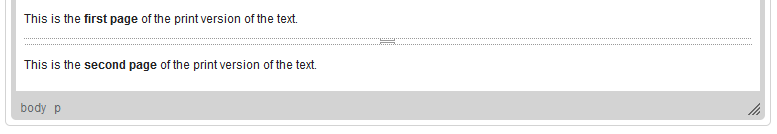 Note that the text entered in a browser-based text editor such as Text Editor differs from a paged medium such as print in that it is not divided into physical pages. If, however, you need to have control over the paging of the printed version, use the