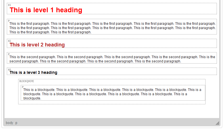 toolbar button, Text Editor will display a grid of dotted frames around the block-level elements of the document along with their HTML tag, like p for paragraph or h1 for level 1 heading, as shown in the figure below.