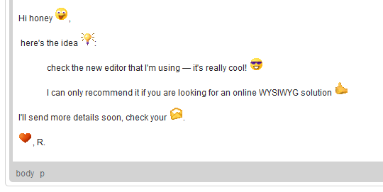 Text Editor is an online editor and no online environment would be complete without emoticons (also called smileys). Text Editor emoticon collection is a set of icons representing user's mood or other frequently expressed concepts.