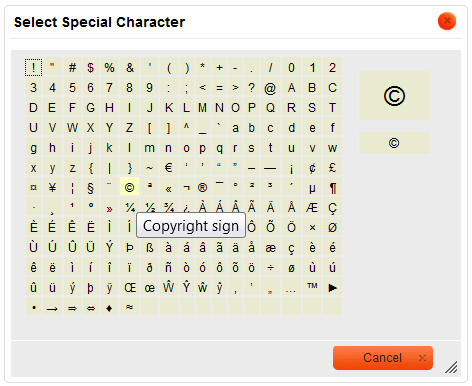 Find a character that you need in the set and select it with your mouse or the Tab key. The dialog window will close automatically and the special character will appear in Text Editor editing area on the position of the cursor in the document.